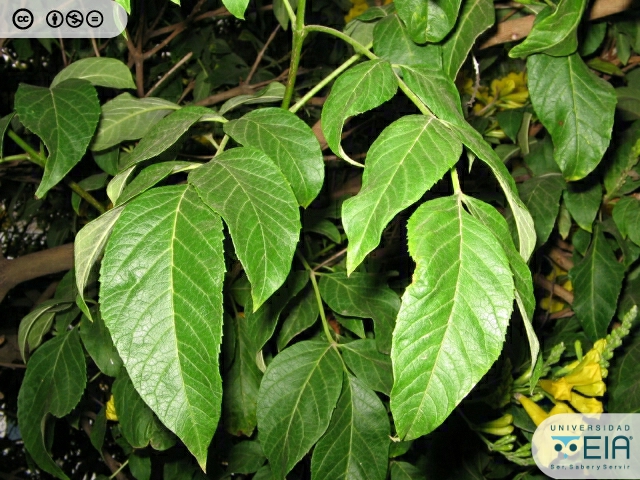 | Atributos foliares | Miden 25 cm de largo por 15 cm de ancho, con 9 folíolos, borde aserrado, alargados y terminan en punta |