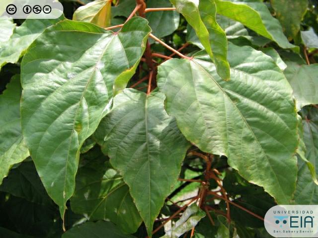 | Atributos foliares | Miden 18 cm de largo por 10 cm de ancho, borde entero y base acorazonada |