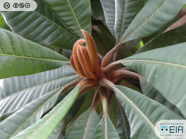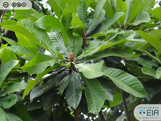 | Atributos foliares | Hojas agrupadas al final de las ramas, ovaladas a lanceoladas, miden de 10 a 30 cm de largo y 4 a 10 cm de ancho |