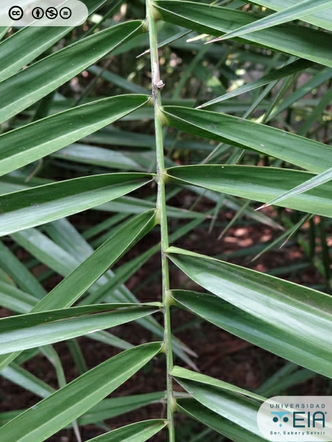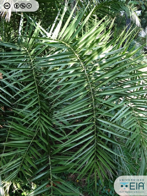 | Atributos foliares | Hojas hasta 3 m de largo; las pinnas en un solo plano, con espinas en la base del pecíolo. |