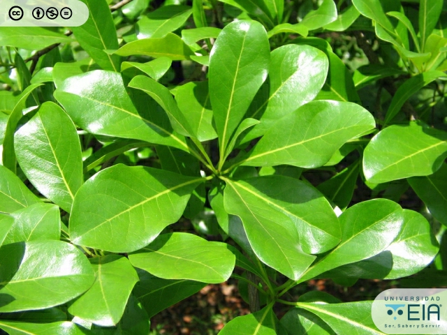 | Atributos foliares | Hojas en forma de espátula, agrupadas al final de las ramas |
