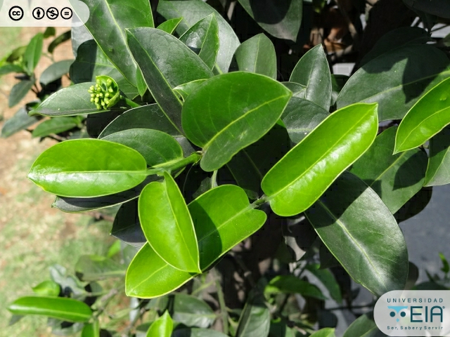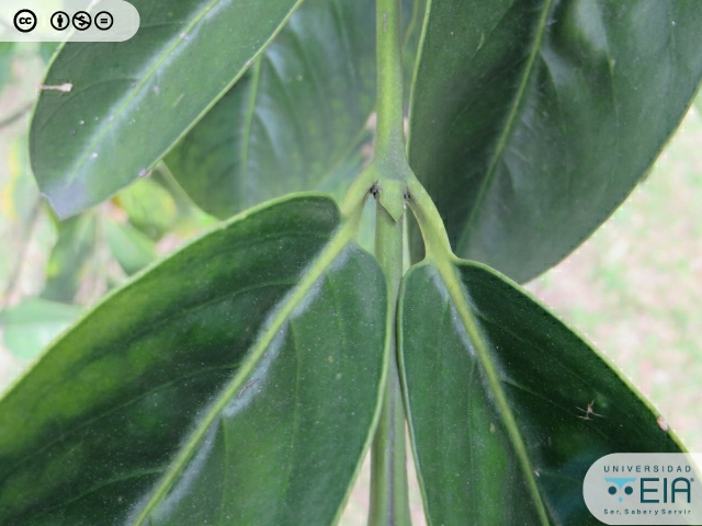 | Atributos foliares | Miden 20 cm de largo por 8 cm de ancho, con forma elíptica, alargadas, borde entero, base obtusa. Con estípulas interpeciolares |