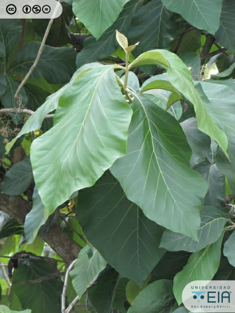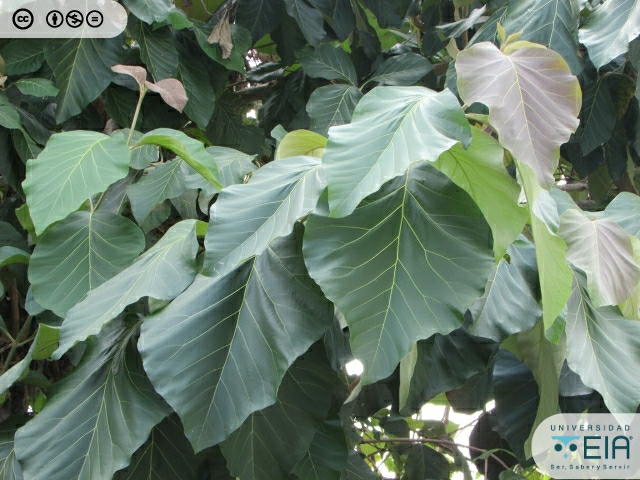 | Atributos foliares | Las hojas miden entre 40 y 60 cm de largo, y entre 25 y 60 cm de ancho, grandes, elípticas y coriáceas |