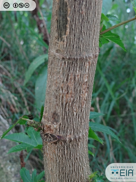 | Atributos foliares | Mide 20 cm de diámetro, palmeada, de borde aserrado y lobulado, nectarios en la base foliar y estípulas terminales |