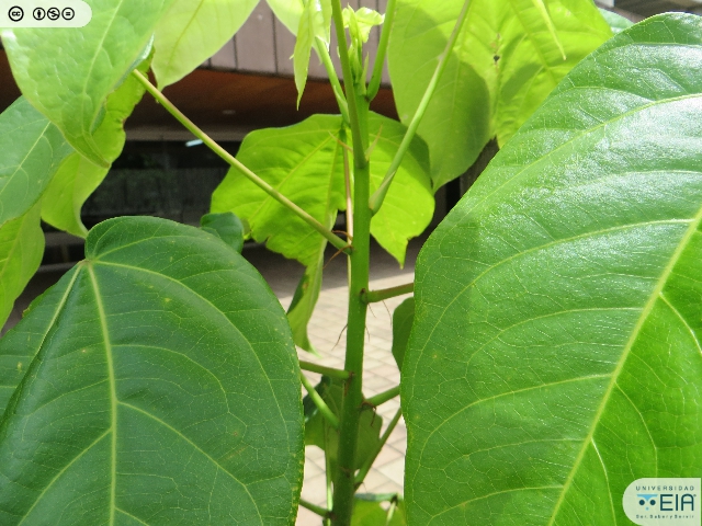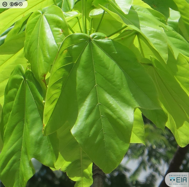 | Atributos foliares | Hojas entre 15 y 30 cm de largo y de 15 a 25 cm de ancho, lobuladas, base cordada. |