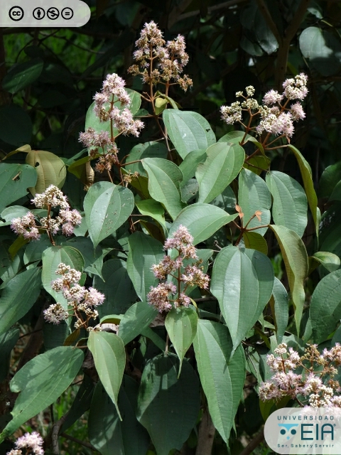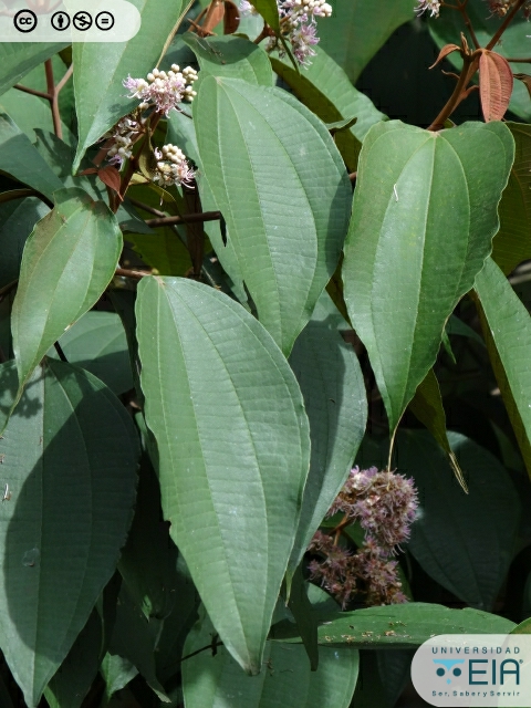 | Atributos foliares | Hojas con nervación curvinervia y cinco nervaduras principales , notorias por el envés, con forma ovado-lanceolada, ápice largamente acuminado y el borde con dientes diminutos; el haz es verde oscura y el envés con tomento denso café claro. |