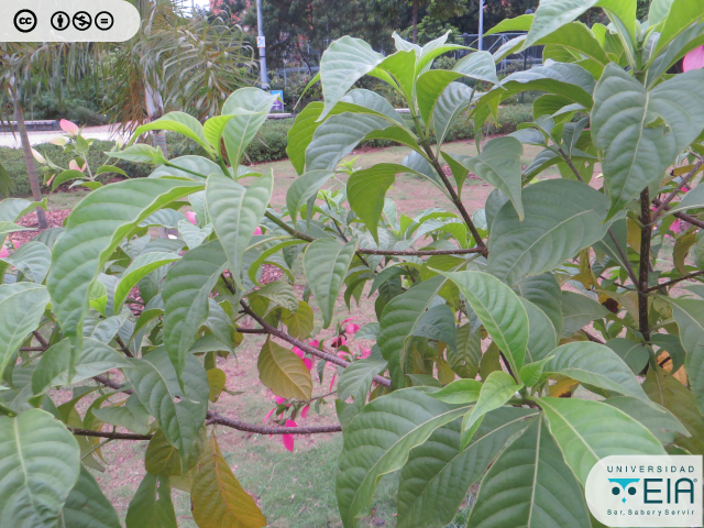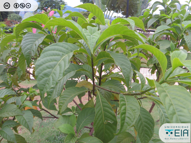 | Atributos foliares | Hasta 25 cm de largo y 8 cm de ancho, el ápice es acuminado y el borde es entero; con estípulas interpeciolares. |