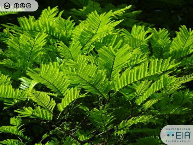 Atributos foliares Entre 8 y 16 pares de pinnas, cada una con 30 a 40 foliolulos lineares con una longitud de 2 cm.