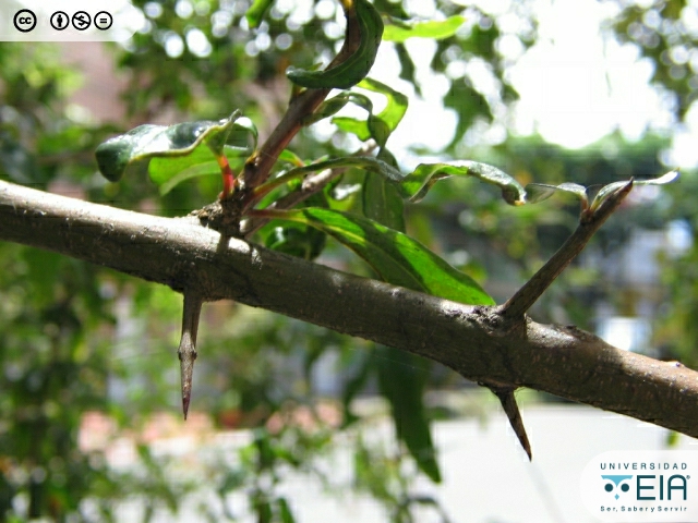 | Atributos foliares | Miden 2,5 cm de largo por 0,8 a 2 cm de ancho, margen entero y textura gruesa, con espinas axilares |