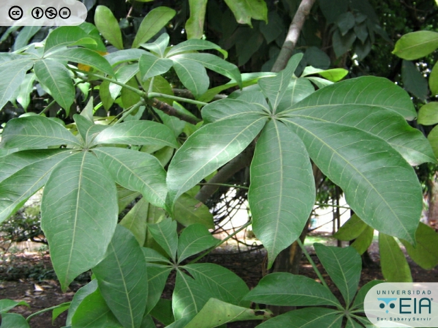| Atributos foliares | Anchas, miden 25 cm de diámetro, con 5 folíolos |