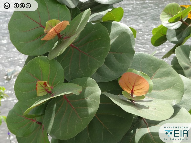 | Atributos foliares | Coriáceas, redondeadas, base acorazonada, con nervaduras y pecíolos rojizos. |