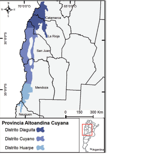 Distrito diaguita: comprende el centro y suroeste de Catamarca y La Rioja hasta el centro de San Juan. La vegetación consiste en arbustos bajos dispersos entremezclados con estepas graminosas.