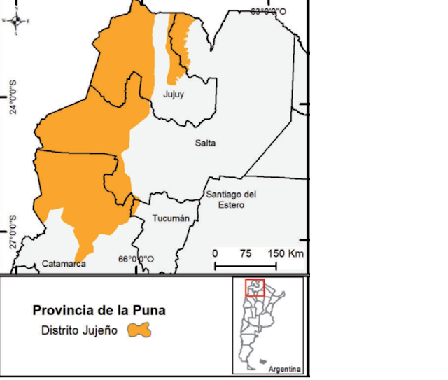 Distrito jujeño: abraca las pcias de Jujuy, Salta y norte de Catamarca: es una gran planicie donde la vegetación consiste de estepas arbustivas o tolares, pastizales o pajonales, bosquecillos de Polypelis y vegas que son lugares permanentemente húmedos, con una vegetación verde todo el año, que retienen el agua que cae en forma de lluvias o nevadas, y se acumula en las depresiones y forma lagunas que son muy extensas y de poca profundidad, con una flora y fauna particular.