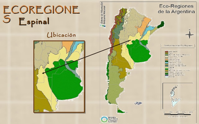 Espinal: cubre una superficie de 297.400km2, de los cuales 1690km2 están protegidos, comprende las provincias de: Corrientes, Entre Ríos, Santa Fe, Córdoba, San Luis, La Pampa, Buenos Aires, Río Negro.