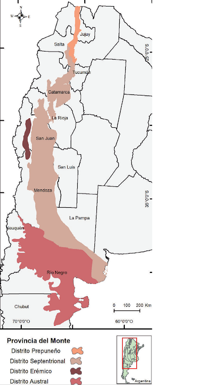 Distrito septentrional: Ocupa la mayor parte del Monte argentino, desde Salta, pasando por el sur de Mendoza, sur de La Pampa hasta el extremo sur de Buenos Aires. La precipitación anual está en el rango de 200 a 400 mm. La vegetación está caracterizada por arbustos dispersos o dispuestos en forma densa denominados jarillales, y la presencia de árboles del género Prosopis y bosques ribereños.
