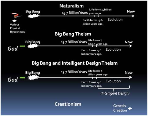 Intelligent Design Theism: There are many variations, but most often the view is that God created the universe, perhaps with the Big Bang 13.7 billion years ago, and then beginning with the appearance of life 4 billion years ago. God supernaturally guided the formation and development of life into the forms we see today.