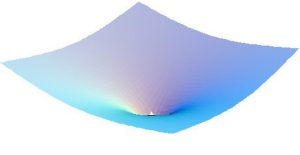 The general theory of relativity theory has additional implications for time. It implies that spacetime can curve or warp locally or cosmically, and it can vibrate or jiggle. Whether it curves into a real fourth spatial dimension is unknown, but it definitely curves as if it were curving into such an extra dimension. Here is a common representation of the situation which pictures our 3D space from the outside reference frame as being a 2D curved surface that ends infinitely deep at a point of infinite mass density, the hole’s singularity.