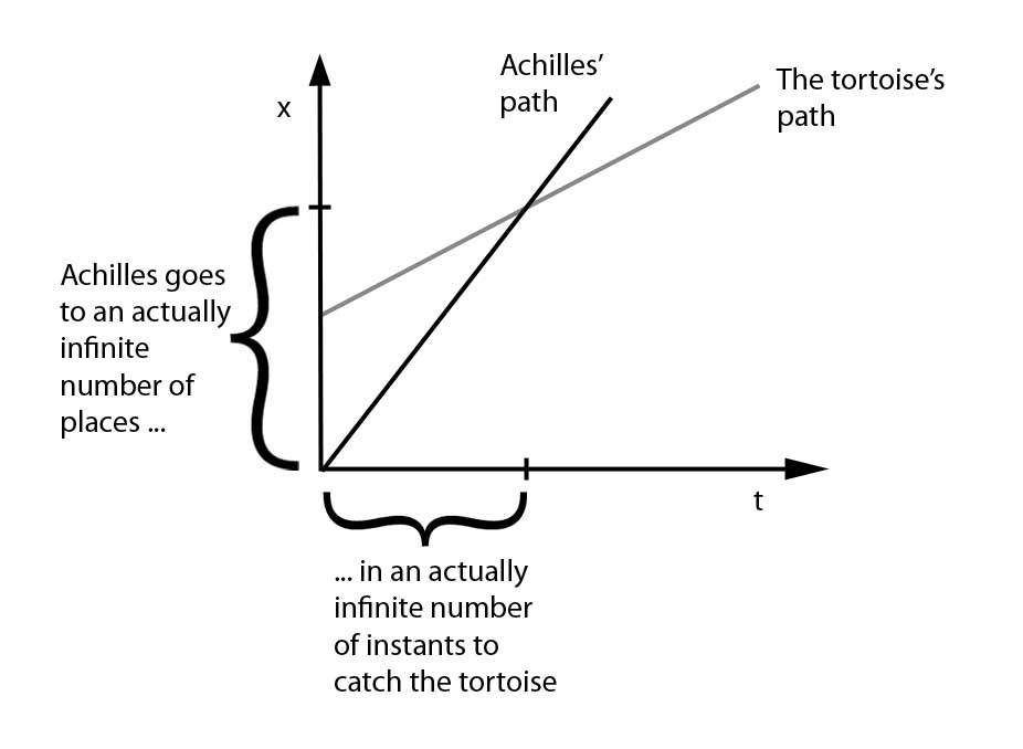 We cannot escape the Achilles paradox by jumping up from our seat and chasing down a tortoise, nor by saying Zeno’s opponents should have constructed a new argument in which Achilles takes better aim and runs toward a place ahead of the tortoise. Because Zeno was correct in saying Achilles needs to run at least to all those places where the tortoise once was, what is required is a better analysis of Zeno’s own argument.