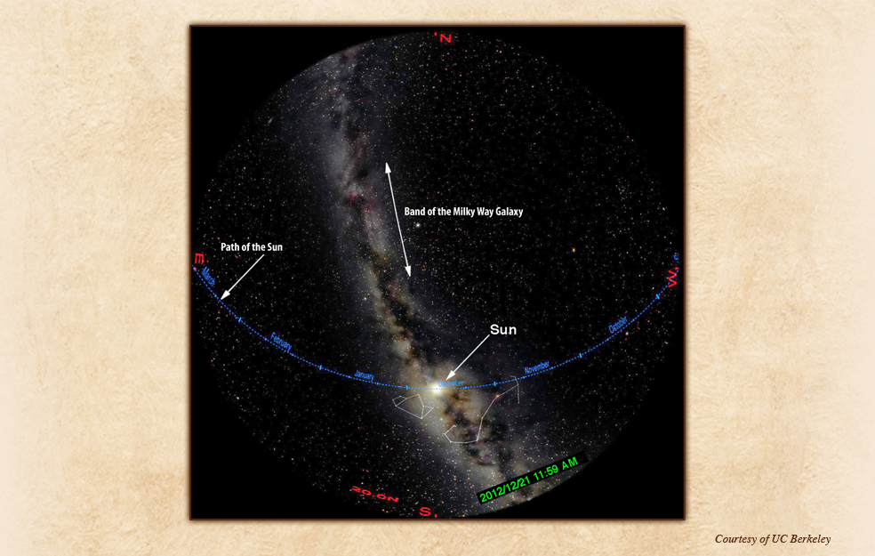 Hecho: En el solsticio del 21 de diciembre de 2012, el Sol, visto desde la Tierra, cruzará el plano de la Vía Láctea cerca de su centro. Este tipo de alineación del paso del Sol con el plano de nuestra galaxia ocurre cada año; por lo tanto, no es muy especial. Sin embargo, la alineación del Sol con nuestra galaxia en el solsticio de diciembre ocurre menos frecuentemente. Esta alineación durante el solsticio ocurre cada año pero solo durante un período de 400 años consecutivos, y dentro de cada ciclo de precesión de 25.772 años. Esto, por lo tanto, es más especial. Esta imagen muestra una vista de planetario del cielo ilustrando la posición del Sol el 21 de diciembre de 2012, la fecha del solsticio. La imagen refleja como se verá el cielo al mediodía en ese día, a la latitud de Chichén Itzá, Yucatán, México. Al mediodía, el Sol estará alto en el cielo, y proyectado contra nuestra galaxia, la Vía Láctea. La Vía Láctea no podrá verse detrás del Sol dado a su fuerte resplandor, pero la imagen de planetario demuestra la alineación del Sol con la banda de la Vía Láctea. Hay cierta evidencia en los registros arqueológicos que los antiguos mayas puede que hayan sabido sobre el fenómeno astronómico de precesión. Es posible que los antiguos mayas establecieran el comienzo del calendario de Cuenta Larga para que el ciclo de 13-baktun se completara en el solsticio de diciembre del 2012. En ese momento, el Sol estará cruzando la Vía Láctea, el camino de los antepasados mayas en el cielo.