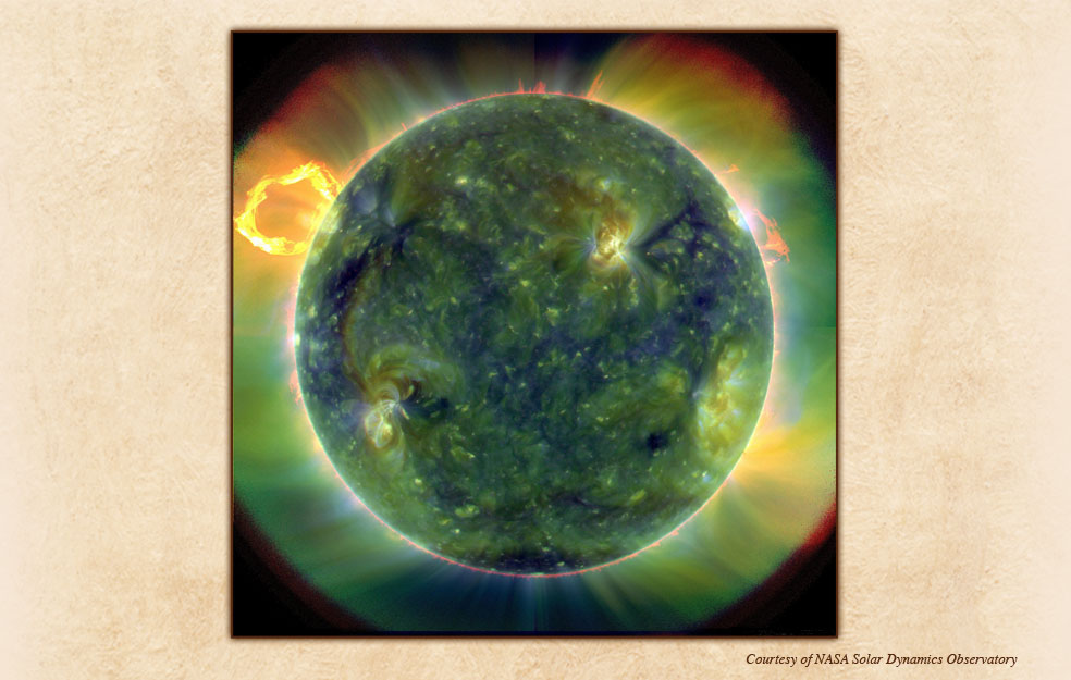 Hecho: El Sol produce tormentas que pueden impactar la Tierra y afectar satélites de comunicación y redes eléctricas. Estas tormentas solares son más frecuentes y fuertes cuando hay muchas manchas solares en su superficie. Las manchas solares son causadas por las fuerzas magnéticas del Sol y aparecen como manchas oscuras en la superficie visible del Sol en un ciclo de once años. La imagen muestra al Sol fotografiado desde el espacio por el Solar Dynamics Observatory, un satélite de la NASA. Las manchas solares han ido aumentando en los últimos años y se espera que el número de manchas solares alcance su punto máximo en junio de 2013. Este punto máximo en el número de las manchas solares está predicho para después del 2012. Además, se predice que el máximo solarserá más débil de lo normal. Esto quiere decir que la posibilidad de que una tormenta solar fuerte impacte a la Tierra es menor que en los ciclos pasados.