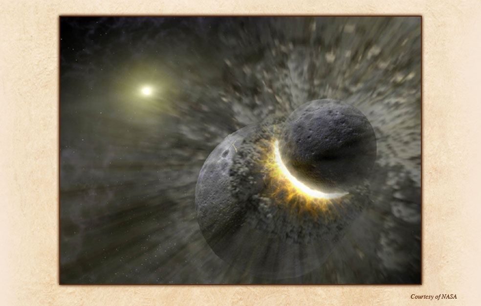Hecho: Algunas teorías proponen que un planeta llamado Nibiru, Nemesis, Tyche o simplemente Planeta X merodea en las afueras del Sistema Solar y es suficientemente grande como para alterar las órbitas de los cometas. Tales cometas serían lanzados a las regiones internas del Sistema Solar chocando con la Tierra. Esta imagen es una interpretación de un artista sobre el choque de dos mundos planetarios. Otras teorías proponen que este Planeta X será lanzado al interior del Sistema Solar causando estragos a medida que viaja por el espacio. Astrónomos continúan descubriendo nuevos objetos en las afueras del Sistema Solar. Por ejemplo, Eris es un planeta enano descubierto en el 2005. Una misión de la NASA llamada WISE puede detectar astros lejanos en el espacio del tamaño de un planeta. Cualquier objeto que pudiera chocar con el interior del Sistema Solar durante el 2012 se habría visto fácilmente a través de WISE durante su rastreo en el 2010. No se han visto tales objetos.