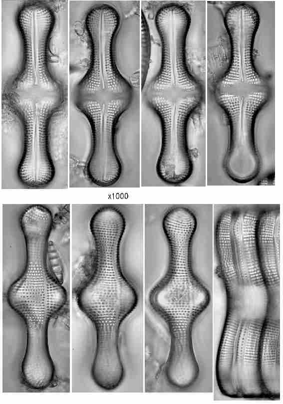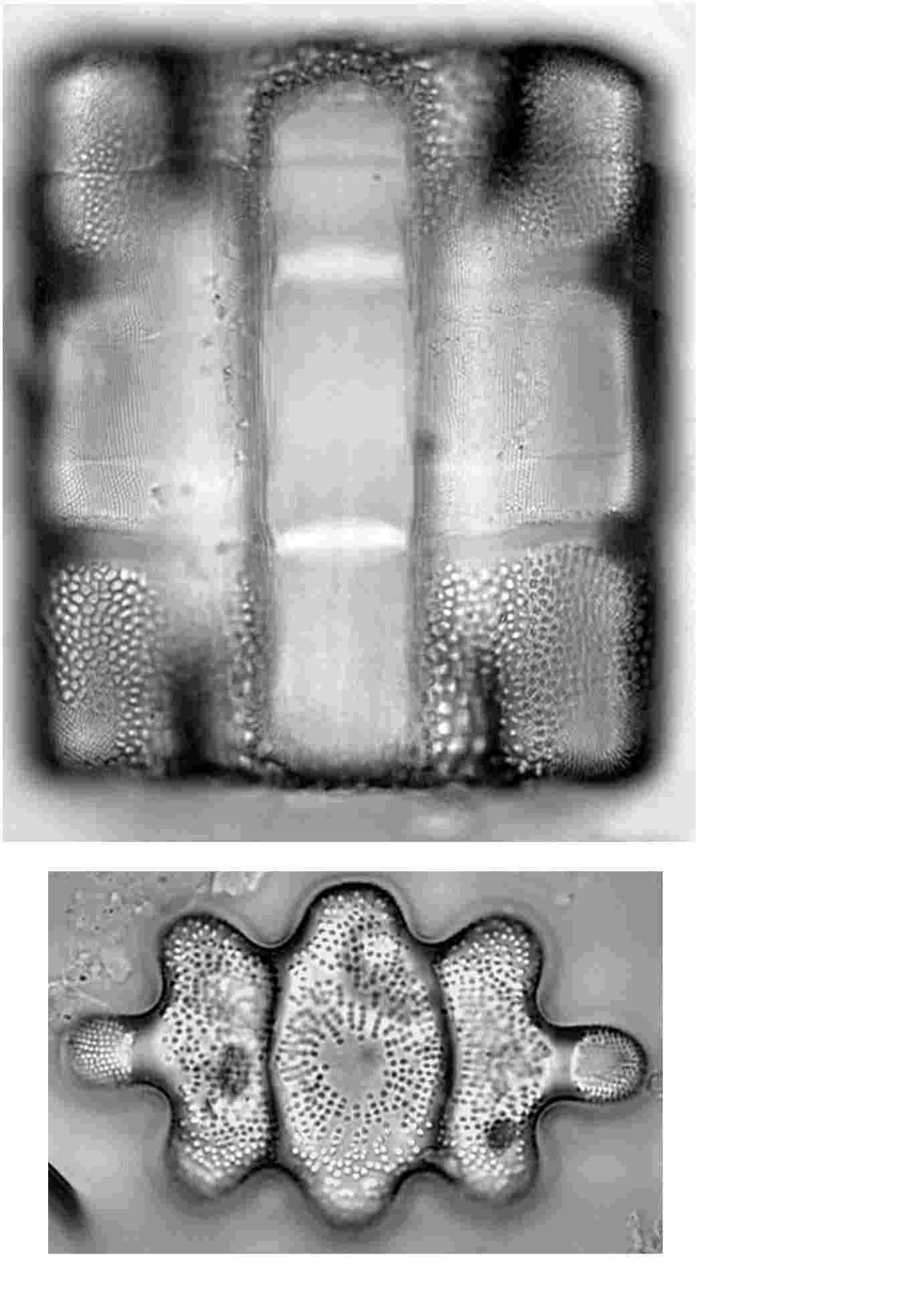 Las Diatomeas o Bacillariophyceae son organismos microscópicos unicelulares acuáticos de color marrón que posen un esqueleto de sílice llamado frústulo. Aparecieron en el Jurásico (200 millones a AP) y se conocen aproximadamente 11.000 especies.