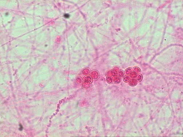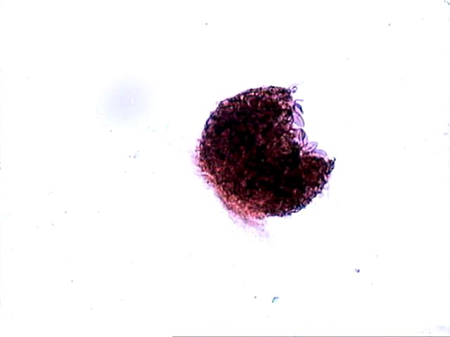Sordaria sp., peritecio con ascos cilíndricos que se ven por transparencia..