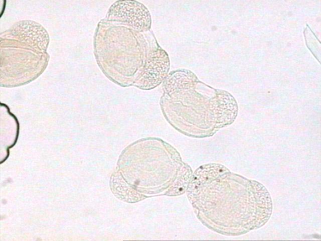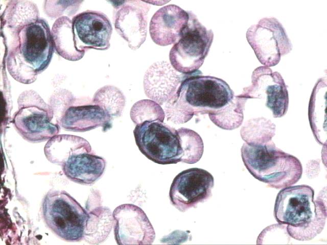 Granos de polen de Pinus sp., al natural y coloreados.