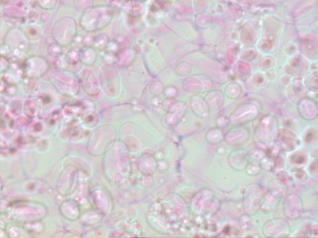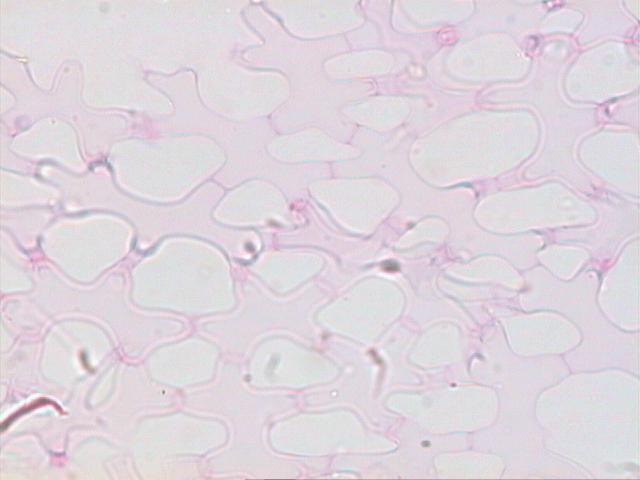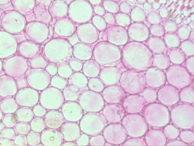 Parénquima amilífero en papa, conteniendo granos de almidón.