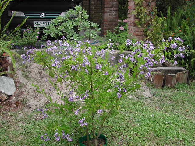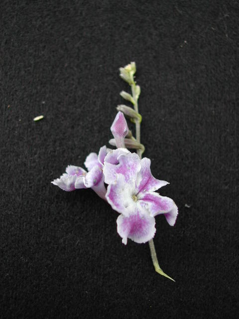 Cáliz tubuloso 5 dentado, corola cigomorfa. Color lila blanquecino,