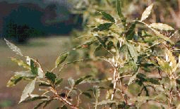 Hojas: simples, subcoriáceas, de 6-8 cm de largo, lanceoladas,