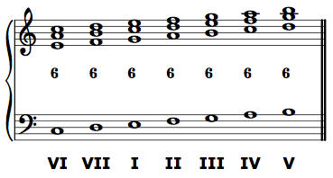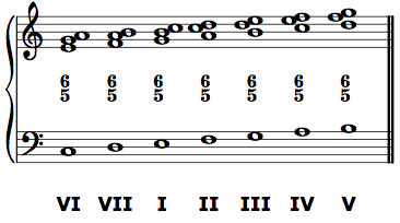 Chords of the sixth that take the figures 6/3 or 6/5/3 are first-inversion chords. They are so named because the third of the chord (the next chord member above the root) is in the lowest voice. However, thinking about inversions while performing an analysis can be cumbersome. It is often simpler to remember that if the figure is 6/3 or 6/5/3 (or an abbreviation such as 6 or 6/5), the root of the chord is the sixth above the bass. If mi is in the bass, and the figure is “6”, the root is do, and the Roman numeral is I. If fa is in the bass and the figure is “6/5”, the root is re, and the Roman numeral is II. And so on.