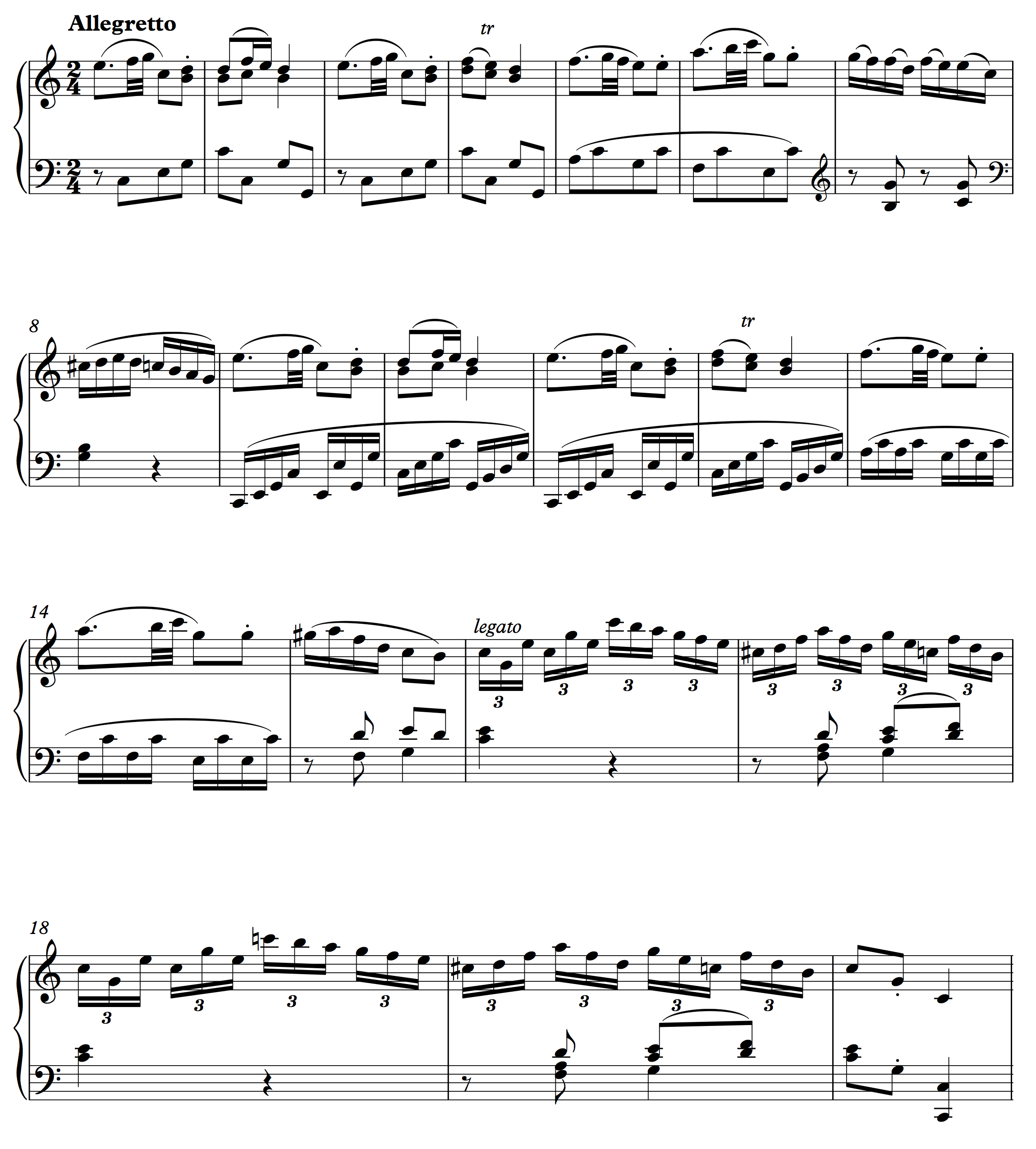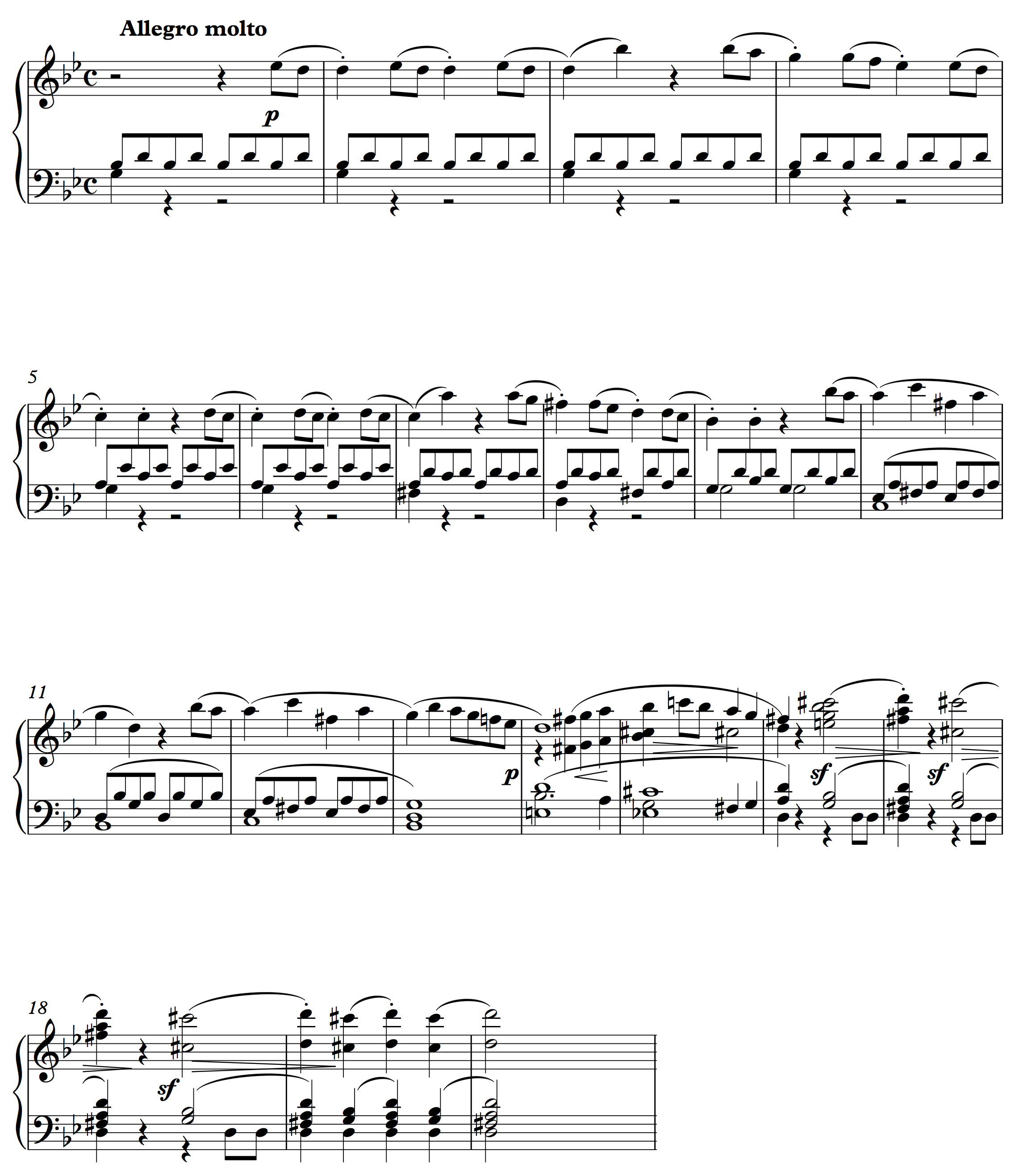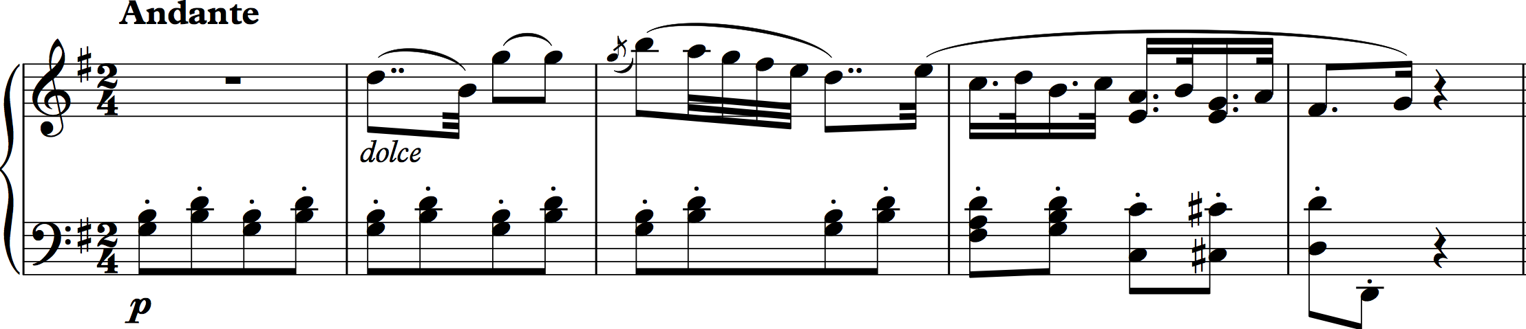 This famous example begins with a one-measure prefix followed a compound sentence. The compound sentence ends with a half cadence in m. 16. (Notice the augmented sixth chord that precedes it.) The succeeding measures stand on the dominant, prolonging the cadence by emphasizing dominant harmony with scale degree 5 embellished melodically.