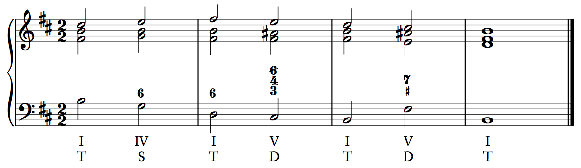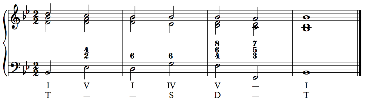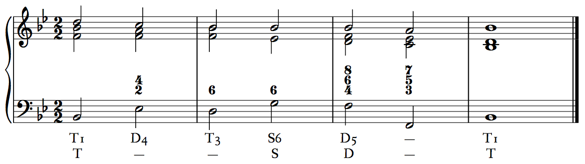 There are two ways in which we will label chords according to function. The first is to label chords with Roman numerals, thoroughbass figures, and functional labels. When doing so, place the appropriate Roman numeral below the bass line, the thoroughbass figure above the bass line (since it represents the upper voices), and place a functional label T/S/D below the Roman numeral (no Tx; simply call a VI chord T). For now this label can simply apply T, S, or D to individual chords; in the future, we will alter this practice slightly in order to show functional prolongation. The first example shows individual chord functions, and the second example shows functional prolongation.