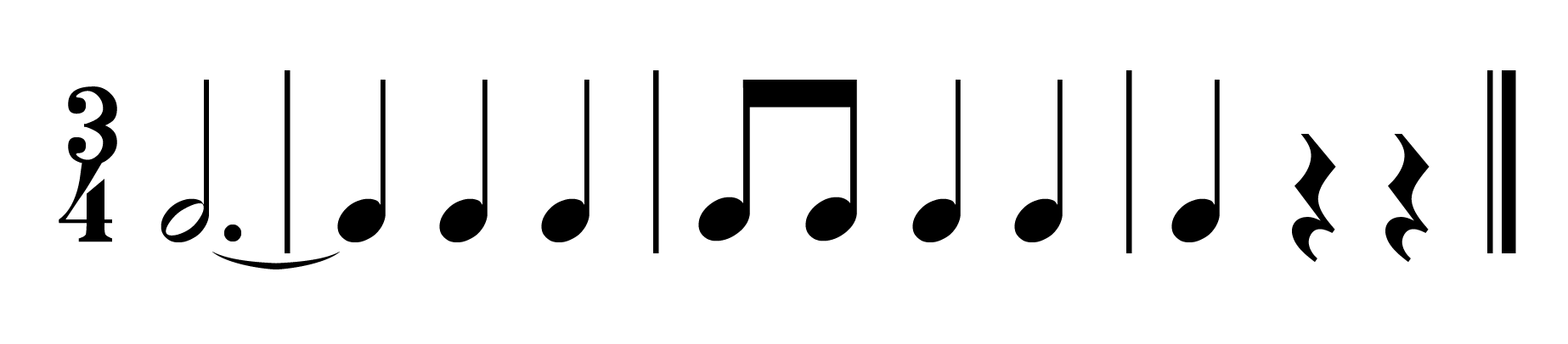 In the example below, the duration of the first pitch is longer than a single measure, so it is represented by tying the dotted half note, which lasts the full measure, to the first beat of the subsequent measure.