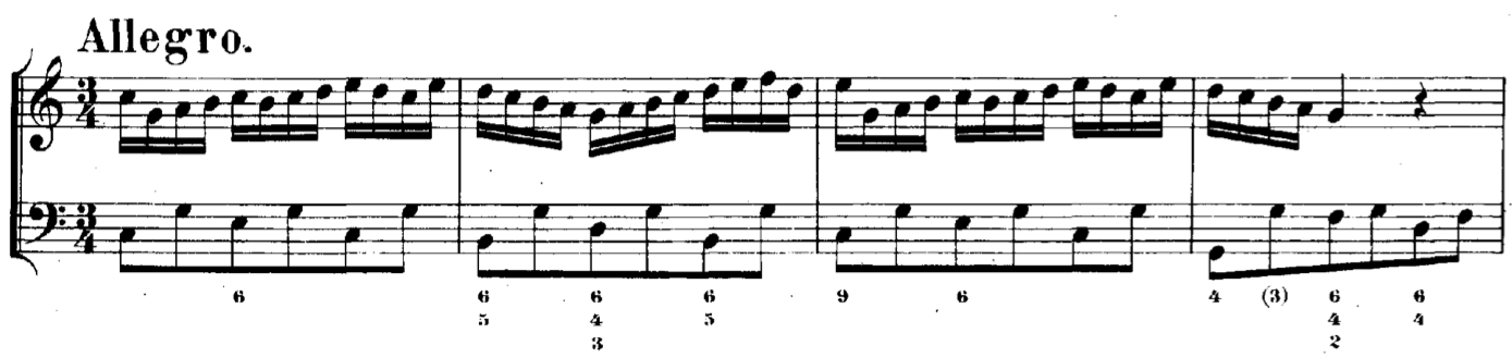 J.S. Bach, Flute Sonata in C Major, ii., BWV 1033. The upper part is played by the flute, the lower part is the basso continuo line, played by a keyboardist who uses the numbers below the staff (figures) to guide the chords played above this bass line.