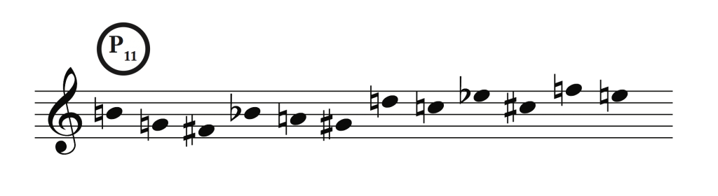 A twelve-tone row might be used as a theme or as a source for motives. Chords might be derived from the row, or the row may be used for both thematic and harmonic purposes. We call the basic ordering, shown above for Op. 27, the prime form (P). And because it begins on B (pitch class 11), we label it P11.