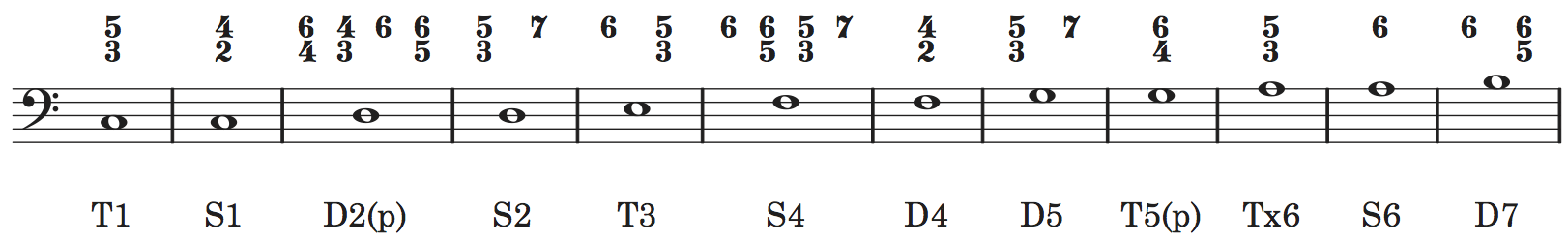 The following chart provides the most common functions for each diatonic scale degree and the most common figures for each functional bass type. Keep in mind that once you have determined the functional progression, you may change the specific figures to smooth out the voice leading in the final realization.