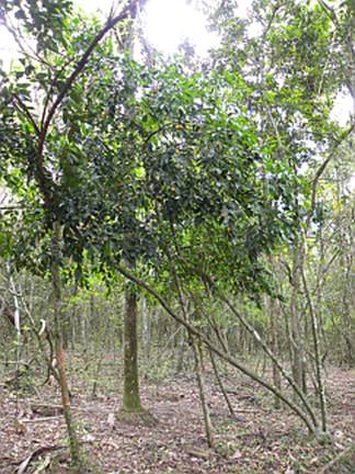 perenifólia e com tronco de casca fina de cor castanho esverdeado. Os ramos