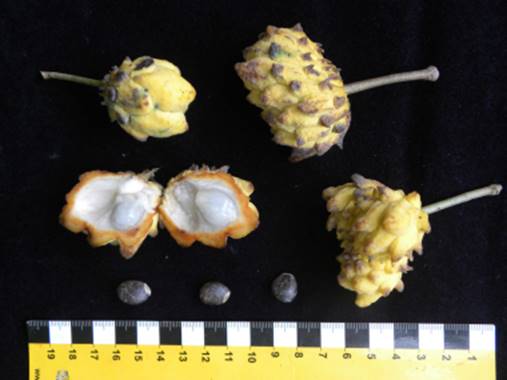 Mudas: As sementes de coloração marrom claro, podem ser armazenadas por 1 ano, em recipientes bem fechados guardados em áreas frescas sem umidade. Visto entrarem em dormência depois de armazenas, devem ser estratificadas ou imersas em solução acida para a semeadura. As sementes frescas germinam em 40 a 60 dias e as mudas atingem 35 cm com 5 meses após a germinação. Recomendo plantar 1 semente por embalagens individuais contendo substrato feito de 50% de terra vermelha, 40% de composto de galhos e folhas trituradas e 10% de areia de rio. A planta produzida a partir de sementes, começa a frutificar no 2ª ou 3ª ano.