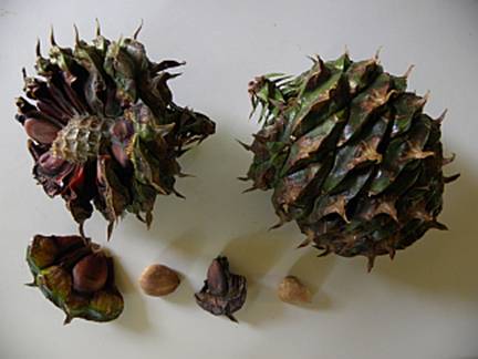 OBSERVAÇÕES: TEMOS O PRAZER DE MOSTRAR OS PRIMEIROS FRUTAS OU PINHÕES DESSA LINDA ARAUCARIA DE ORIGEM AUSTRALIANA. OS FRUTOS SÃO GRANDES, MEDEM QUASE 20 CM E AS SEMENTES ESBRANQUIÇADAS MEDEM DE 3,5 A 6,5 CM DE COMPRIMENTO, PODENDO SER CONSUMIDAS IN-NATURA SEM PRECISAR COZINHAR. A PLANTA CRESCE RAPIDO E A ARVORE COMEÇA A FRUTIFICAR COM 6 ANOS APÓS O PLANTIO.