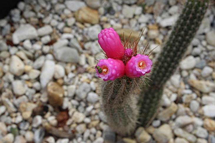 Características: Planta suculenta, arbustiva e espinhenta, formando agrupamentos de hastes com 50 cm a 2 m de altura a depender da variedade e local de cultivo. Pode ter hábito inicial ereto, ou ramificado e até trepador (subindo em apoio - plantas ou roxas). Os caules são cilíndricos com 10 a 80 cm de comprimento entre as juntas ou articulações e 3 a 6 cm de diâmetro, de cor verde escura ou prateada ou avermelhada a depender da variedade. Os ramos tem 9 a 12 costelas bastante rasas com aréolas (grupos de espinhos) com lã escura com distancia entre si de 05 mm a 1 cm. As partes jovens tem espinhos acompanhados de pelos longos parecendo teia de aranha. Nas aréolas maduras há 5 a 6 espinhos entrais de 2 a 3 cm de comprimento, ficando pretos na idade avançada e espinhos radiais menores de 1,2 a 2 cm de comprimento. A parte floral surge no ápice ou nas articulações no pseudocéfalo que tem certas marrons e lã de 2 a 3 cm de comprimento de onde brotam flores tubulares de 1,5 a 3,7 cm de comprimento de cor rosa ou vermelho-violeta que se abre durante o dia com sépalas semelhantes a escamas curtas ao entorno do estames (órgão masculino) de 4 a 6 mm de comprimento e estigma (órgão feminino) mais desenvolvido de cor amarelada. Os frutos são bagas avermelhadas, globosas e lisas com casca fina e tubo floral adpresso no ápice, e a polpa é gelatinosa, transparente com inúmeras sementes pretas diminutas.