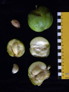 Fruto da variedade redonda mostrando a polpa e sementes. |