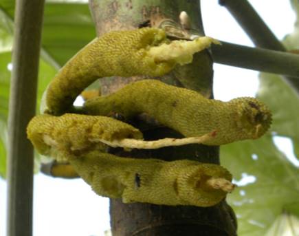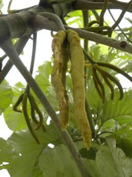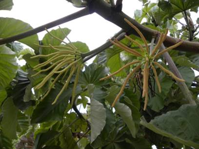 Usos: Frutifica de dezembro a fevereiro. Os frutos grandes, alongados e macios, desmanchando-se facilmente quando maduros. A polpa é úmida, doce, saborosa e refrescante, lembrando o sabor de doce de figo. Os frutos verdes ou maduros são alimento de diversas espécies de pássaros e animais, não podendo faltar em reflorestamentos. As folhas enormes caem no chão e produzem muita matéria orgânica após apodrecidas recuperando até solos pobres. A arvore é muito ornamental e produz ótima sombra.