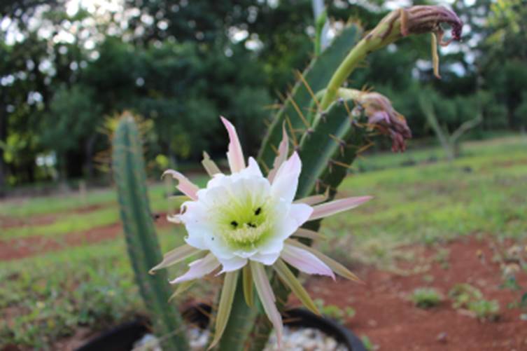 Características: Planta suculenta, arbustiva e espinhenta, formando agrupamentos de cladódios (ramos) com 50 cm a 3 m de altura a depender da variedade e local de cultivo. A planta é formada por cladódios (ramos com 4 a 6 costelas) de cor verde descura, verde amarelada, ou azulada na juventude, medindo 20 a 40 cm de comprimento por 4 a 6 cm de diâmetro. Cada costela tem altura de 2,5 a 4,5 cm por 0,6 a 1,5 cm de largura e na margem há aréolas (gemas de brotação) de onde saem espinhos em vez de folhas (para proteger o cladódio (caule que é comestível quando jovem). As aréolas estão distanciadas entre sí por 1,5 a 3 cm de onde surgem 1 a 4 espinhos centrais de 2 a 5 cm de comprimento e 8 radiais (no entorno) com até 2,5 cm de comprimento. De acordo com a variedade ou idade da planta os espinhos podem ser amarelados, cinzentos ou pretos. As brotações tem pilosidade lanosa. As flores surgem nos ramos mais velhos nas aréolas laterais e medem 11 a 19 cm de comprimento por 9 a 12 cm quando abertas. Os segmentos do perianto ou invólucro floral tem cerca de 46 peças, sendo que os externos medem 3,2 a 4,5 de comprimento por 1,2 a 1,7 cm de largura, com forma lanceolada a ovalada de coloração verdes; e os internos medem 8 cm de comprimento por 1,2 cm de largura e são lanceolados e alvos. Os estames são mais de 500 com filetes ou tubos medindo 4 a 8 cm de comprimento e o estilete (tubo feminino) central e único mede de 15 a 17 cm de comprimento com estigma (órgão receptor) creme com até 2,2 cm de comprimento. Os frutos são do tipo baga, elípticos (alongados ou arredondados) deiscentes (com abertura longitudinal lateral natural) com casca carnosa com espessura de 4 a 6 mm e coloração vermelha, azulada ou amarela com polpa branca flocosa, agridoce envolvendo pequenas sementes crocantes.