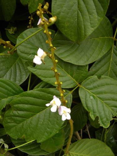 CARACTERISTICAS: É uma liana volúvel (que se enrola) e lenhosa, perene com ramagem que se enrola em outras plantas, atingindo a copa das arvores mais altas. O tronco é cilíndrico e volumoso, com casca fina e coloração castanho-acinzentado. Os ramos novos e folhas são densamente pilosos (com pelos longos esbranquiçados). As folhas são compostas de 3 folíolos largo ovados, de textura cartácea como cartolina) com base e ápice obtusos ou arredondados, densamente pubescente (coberto de pelos curtos) na faze juvenil, tornando-se glabros (sem pelos) na faze adulta. As folhas são caducas, ou seja, caem no inverno, e tem as seguintes medidas: 6 a 10 cm de comprimento por 4,5 a 7 cm de largura, sob pecíolo (haste ou suporte) piloso com 5 a 15 cm de comprimento, tendo como característica a sua base e ápice mais espesso ou grosso. As flores nascem nas axilas das folhas em racemos simples e eretos, medindo 7 a 16 cm, e contento de 8 a 24 flores papilionoides (com formato de borboleta) e coloração branco azulada. A flor mede 2 a 3 cm quando aberta e é muito bonita. Os frutos são cápsulas do tipo vagem indeiscente (que não se abre naturalmente), medindo 6 a 20 cm de comprimento por 4 a 5,5 cm de largura, adquirindo coloração amarelo creme quando maduro, tento a superfície pilosa. No meio da vagem há um friso (como se fosse um zíper) que facilita a abertura e dentro existem de 2 a 8 sementes recoberta com fina camada de arilo branco semelhante a um ingá. As sementes são grandes, e medem 4 a 5 cm de altura por 1,2 a 2,7 cm de altura.