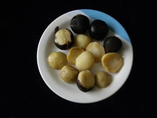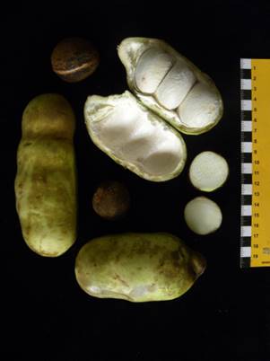 Usos: Frutifica nos meses de dezembro a janeiro. Os frutos devem ser colhidos assim que estiverem amarelados ou recolhidos assim que caírem no chão. Devem ser aberto manualmente, e o arilo que envolve as sementes podem ser consumidos in natura e tem sabor semelhante ao ingá. As sementes devem ser limpas do arilo e secas ao sol por durante 1 dia. Após isso podem ser armazenadas ou utilizadas para consumo. AS SEMENTES NÃO PODEM SER CONSUMIDAS FRESCAS. Antes de consumir as sementes devem ser fervidas na agua por 15 a 20 minutos ou assadas no forno por 10 a 15 minutos. As sementes cozidas ficam com sabor que lembra a batata-doce e pinhão; já as sementes assadas adquirem textura e sabor de coco. As sementes assadas podem ser trituradas e transformadas em farinha para diversos usos culinários como tortas, bolos, bolachas e pães. As sementes são ricas proteínas, minerais e vitaminas. A planta também pode ser cultivada como ornamental por causa dos cachos de flores azuladas. Também recomento o plantio da espécie em áreas reflorestadas visando fornecer alimento para a fauna silvestre.