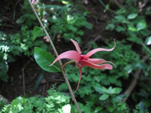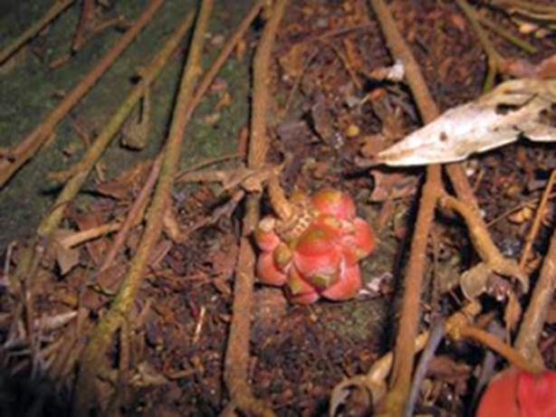 Características: árvore de pequeno a médio porte com copa cilíndrica, atingindo 2,5 a 6 m de altura. O tronco é único ou múltiplo com 10 cm a 20 cm de diâmetro, com casca fendida na vertical, e de cor castanho claro. As folhas são simples, cartáceas (como cartolina), alternas, ovadas (forma de ovo) no terço inferior, com 10 cm a 15 cm de compr. e 3 a 5 cm de larg.; com base obtusa (arredondada) e ápice acuminado (ponta longa). Essa espécie pode ser facilmente identificada por se observar os pecíolos (cabinhos), as gemas de brotação e dorso das folhas coberto de tricomas (pelos) com forma de escama de cor amarelada. As flores nascem em ramos flageliformes (como chicote) com 10 a 55 cm que surgem apenas na base do tronco. A flor têm seis pétalas dispostas em espiral, longas, avermelhadas e com 7 a 18 cm de comprimento. O fruto é um sincárpico (conjunto de segmentos ou gomos) de 4 a 5 cm, ficando primeiro com cor rosada, passando para o vermelho escuro ao amadurecer, contendo 8 a 12 gomos que se destacam, com casca angulosa, envolvendo uma semente oval de até 1 cm de comprimento, coberta de arilo gelatinoso.