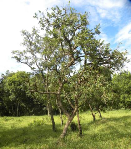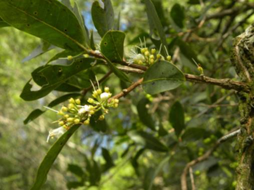 Características: É um arbusto com tronco tortuoso, crescendo de 1,5 a 2,5 metros de altura. A copa é rala e os galhos são grossos pouco ramificados e facilmente identificados por casca cinza esbranquiçada com fendas profundas no sentido longitudinal. As folhas são simples, opostas, cruzadas, de consistência cartácea (como cartolina), dispostas alternadamente ou verticiladas (com 3 ou 4 folhas) com pecíolo (haste ou suporte) amarelado de 4 a 5 mm de comprimento. A lamina mede 3 a 5 cm de comprimento por 1,2 a 2 cm de largura; tem forma estreita elíptica (com igual largura) ou oblanceolada (com forma de lança invertida, com ponta voltada para base), com base aguda e ápice obtuso ou arredondado. As flores são hermafroditas, reunidas em numero de 2 a 5 em umbelas (tipo de cacho) ramifloras (que nascem nos ramos desnudados). As flores medem 1,5 cm na antese, tem pedúnculo e cálice amarelado e corola com pétalas e estames brancos. Os frutos são drupas de até 0,8 a 1,4 cm de largura por 8 a 10 mm de altura, achatado nos polos, amarelos ou pretos quando totalmente maduros.