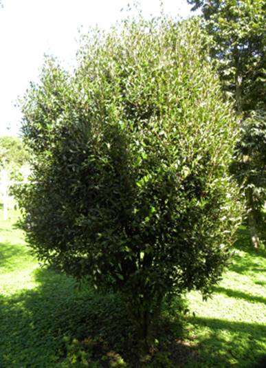 Características: arvore de pequeno porte quando cultivada a pleno sol, atingindo 2 a 4 m de altura. Na mata a arvore atinge de 5 a 10 m de altura. O tronco é marrom escuro com casca que se desprende em placas retangulares. A copa é piramidal, perenifólia, densa e com brotações avermelhadas. As folhas são subcoriáceas (rijas), de cor verde escura, glabra (sem pelos) oval-oblongas (forma de ovo alongado) medindo 4 a 6 cm de comprimento por 1,5 a 2,5 cm de largura, com base longo cuneada (forma de cunha) e ápice brevemente obtuso (arredondado). As flores nascem em pequenos racemos (tipo de caco curto) axilares de 3 a 6 cm de comprimento com 4 a 8 flores sob pedúnculo (haste ou suporte) de 1,5 a 3 cm, com 4 sépalas esverdeadas lanceoladas e 4 pétalas brancas de 1,2 a 1,6 cm de comprimento. Os frutos são bagas de 8 mm a 1,4 cm de diâmetro.